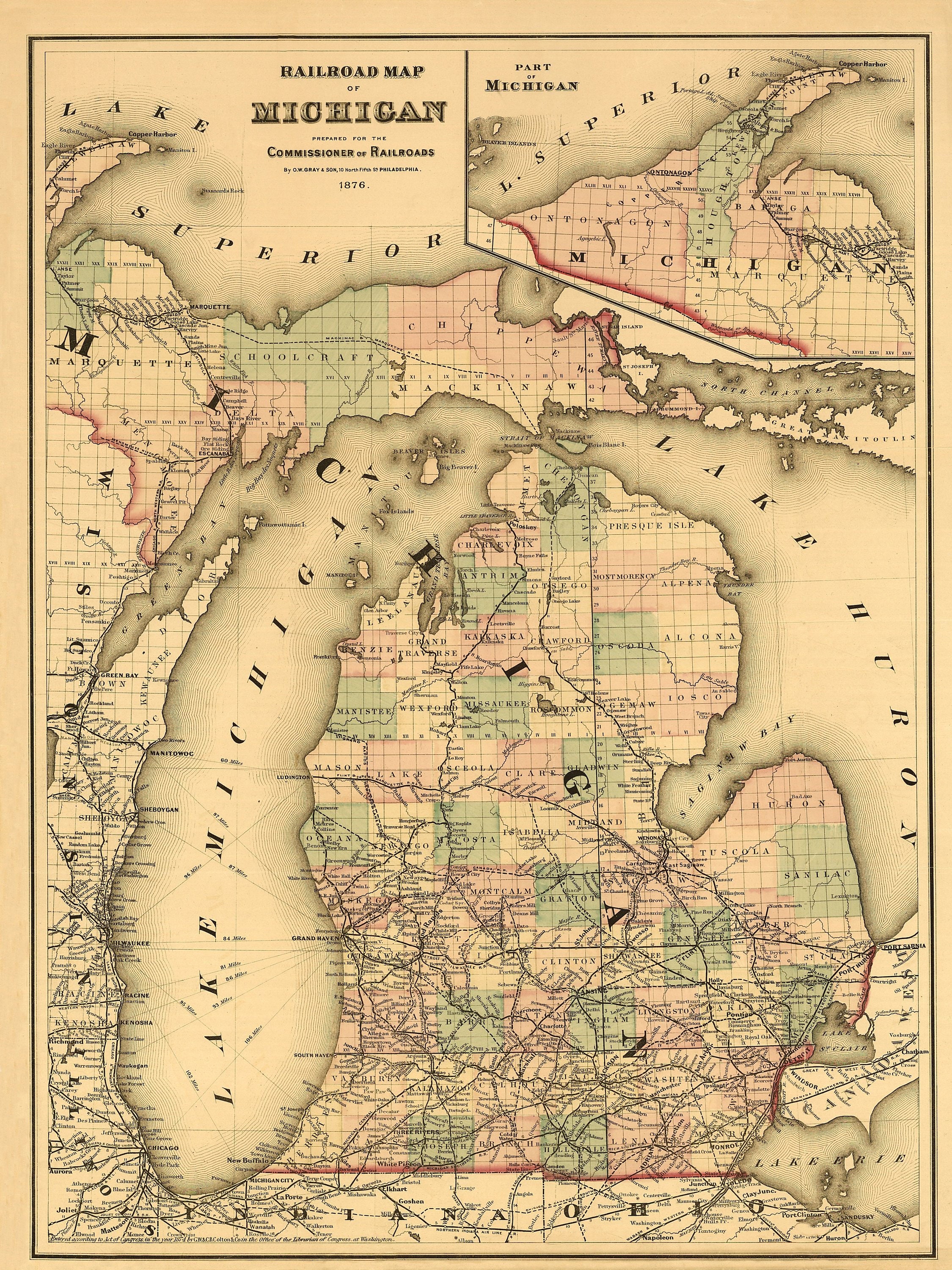 1876, Michigan, Michigan Map, Old Michigan Map, Great Lakes Map
