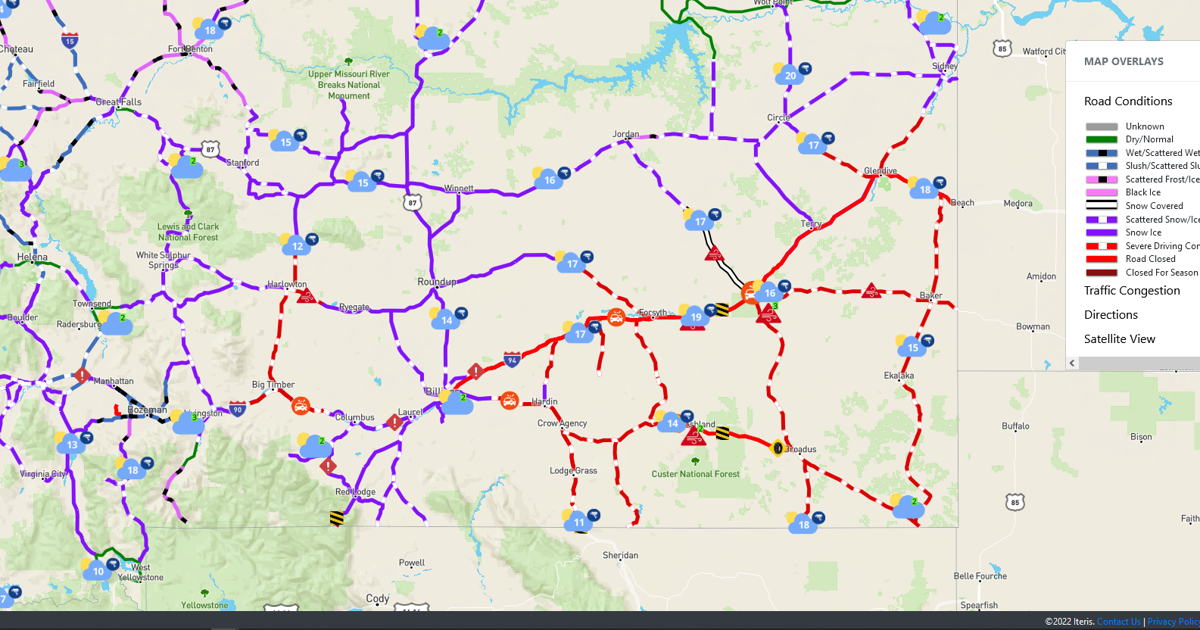 State Of Montana Road Conditions Map Traveler Information | Montana Department of Transportation (MDT): Flathead County Roads and Sheriff’s Departments announced Hodgson Road will close from Trumble Creek to near Whitefish State Road Wednesday afternoon due to wea . A map released by the National A plow clears snow from a road on January 12, 2024 in Des Moines, Iowa. National Weather Service warnings or advisory notices are in place on Saturday for almost .